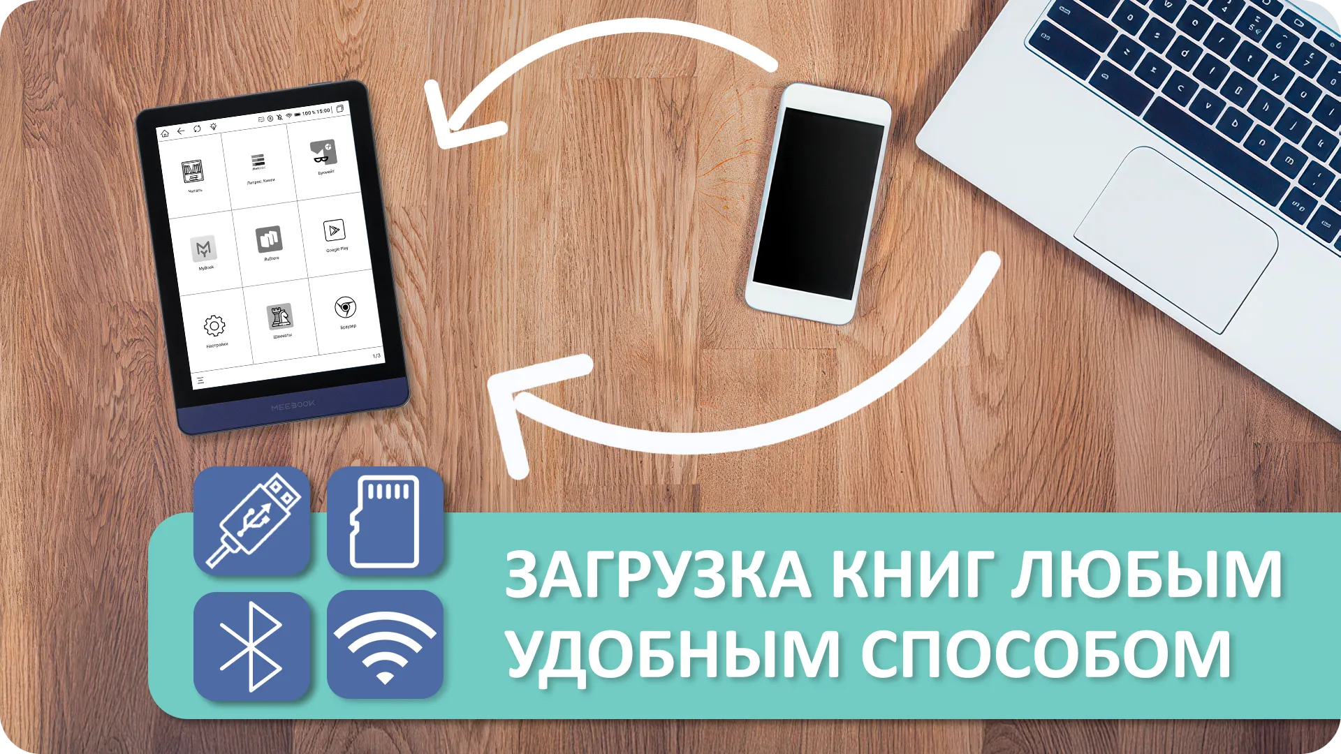 Вы можете передавать книги и другие файлы на M6 несколькими способами: через USB, Bluetooth или Wi-Fi со своего смартфона или компьютера. Или просто вставьте в M6 карту памяти с вашей библиотекой — всё готово!