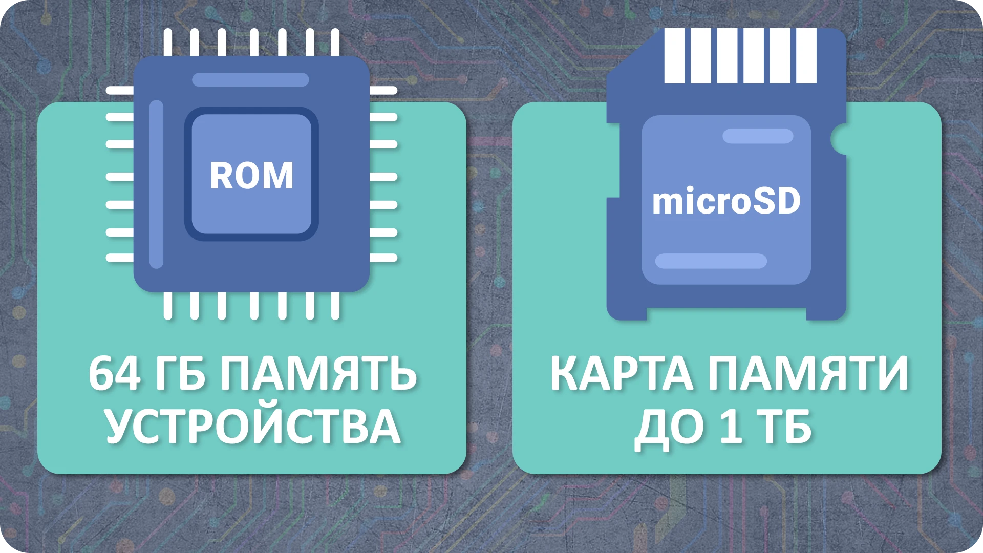 ⬤ 64 ГБ ВСТРОЕННОЙ ПАМЯТИ + СЛОТ ДЛЯ MICROSD