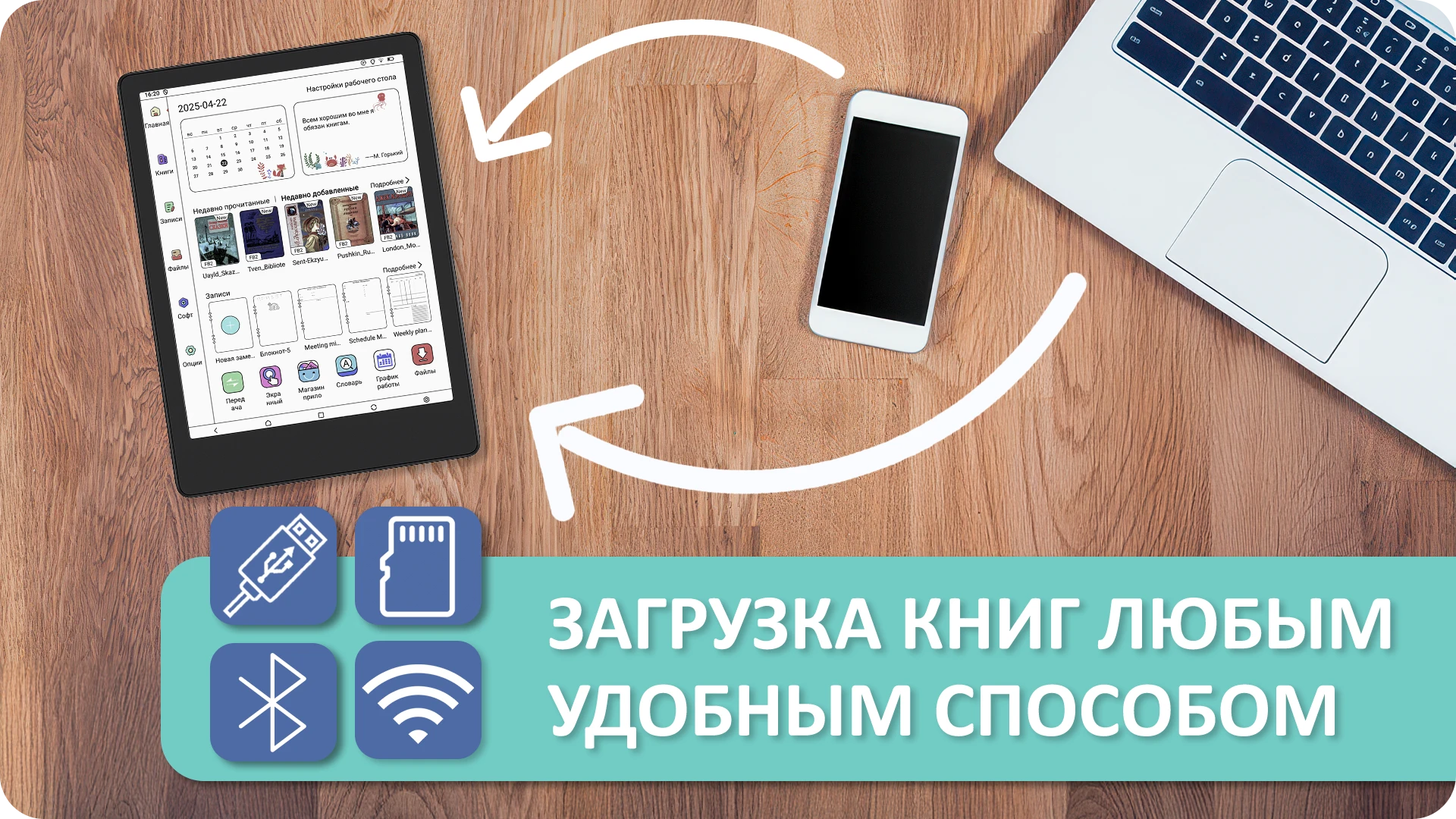 Передавайте книги и документы на Meebook M8C напрямую с телефона* или компьютера по Wi-Fi, Bluetooth или через кабель USB. Также поддерживается чтение с карты microSD — просто вставьте носитель с вашей библиотекой и читайте без дополнительных настроек.